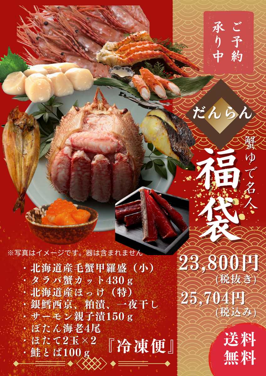 福袋【だんらん】 販売価格 26,180円(税込み) 会員価格 (税込み) 通常価格 (税込み) 在庫 商品コード JANコード 数量 - + カートに入れる カテゴリー 福袋・ごちそう袋・蟹ざんまいセット カテゴリー 福袋・ごちそう袋・蟹ざんまいセット 毛蟹(活・ゆで・冷凍) タラバ蟹(活・ゆで) ズワイガニ(活・ゆで) ゆで冷凍タラバ姿・脚 毛蟹甲羅盛 蟹剥き身 蟹珍味・水産加工品(ラー油・パスタソース他) いくら醤油漬 タラコ・生うに・冷凍うに お刺身・海鮮丼 紅鮭・時鮭・サーモン 銀だら ホッケ・イカ・ニシン・コマイ 鮭とば・ほっけくん 訳あり商品 オオズワイ蟹甲羅盛 蒲焼 2025年11月 日 月 火 水 木 金 土 1 2 3 4 5 6 7 8 9 10 11 12 13 14 15 16 17 18 19 20 21 22 23 24 25 26 27 28 29 30 2025年12月 日 月 火 水 木 金 土 1 2 3 4 5 6 7 8 9 10 11 12 13 14 15 16 17 18 19 20 21 22 23 24 25 26 27 28 29 30 31 臨時休業